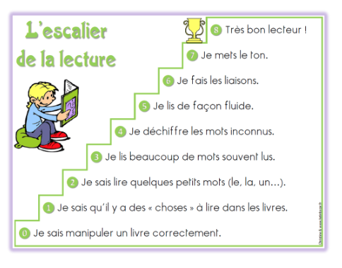 Le principe de base est tout simple : l’escalier est affiché dans la classe (au coin lecture tant qu’à faire) et les élèves peuvent s’y situer tout au long de l’année pour voir leurs progrès. Il n’y a pas d’affichage des prénoms sur l’escalier, le but n’étant pas de se (dé)valoriser en se comparant (...)