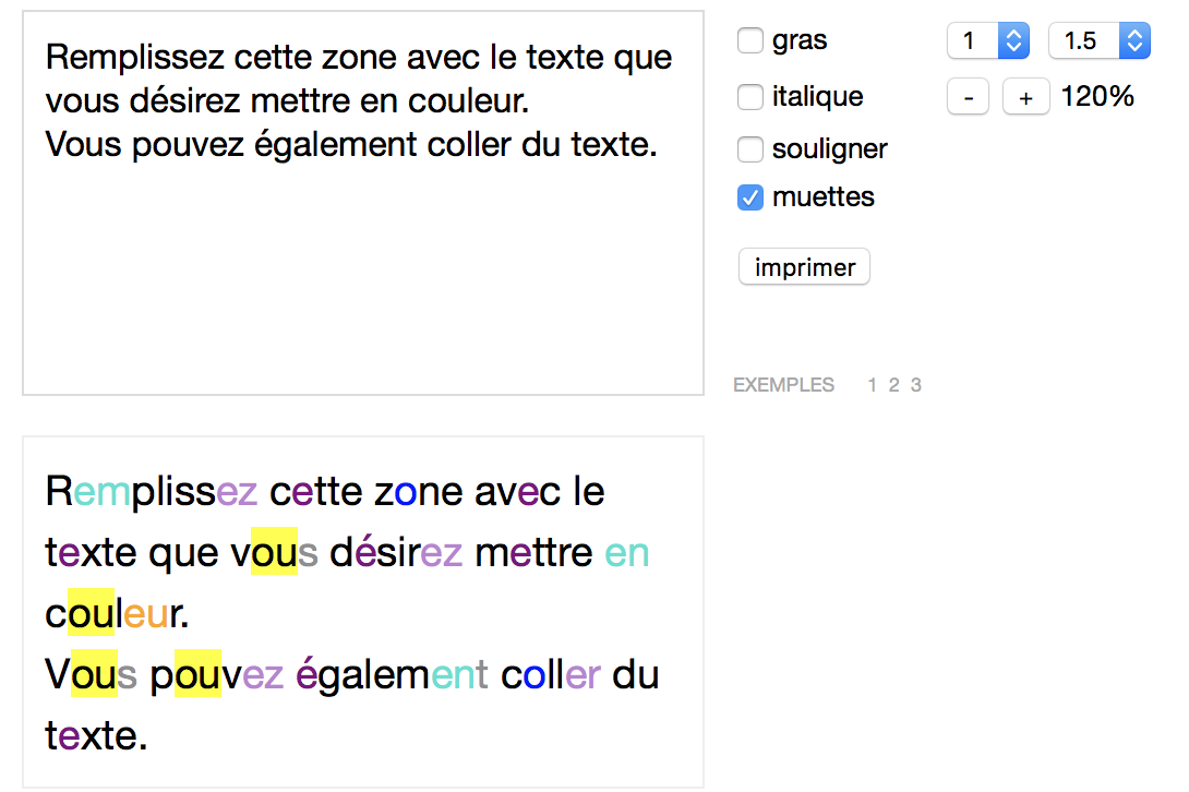 Ce site permet de coloriser les graphèmes. Très utile pour les élèves en difficulté de lecture Il suffit de coller le texte souhaité dans la zone prévue et le texte apparaît avec les graphèmes mis en évidence , en couleur. Note de l'équipe BDRP : cliquer sur le lien Tester l'application