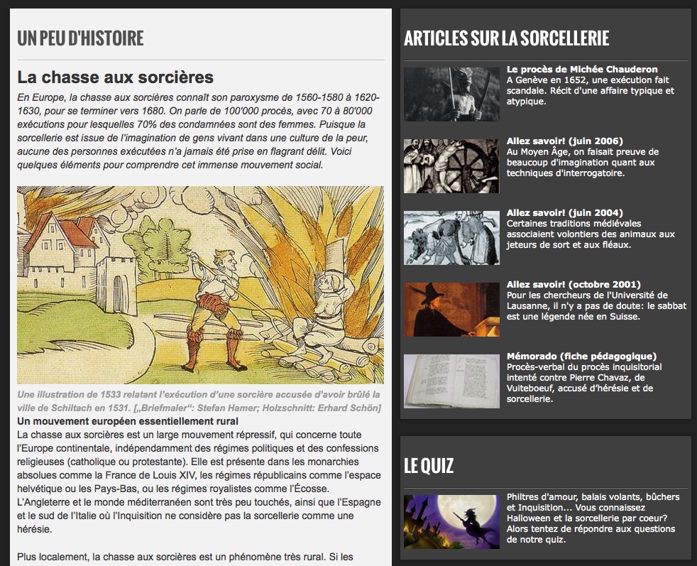 Au Moyen Âge, la Suisse romande a été la championne de la chasse aux sorcières. À lui seul, avec l'aide de l'Inquisition, le pays de Vaud en a condamné 2'000. Voici quelques éclairages sur cette sombre période. Ressource repérée sur rts.ch PER > SCIENCES HUMAINES ET SOCIALES > HISTOIRE > RELATION (...)