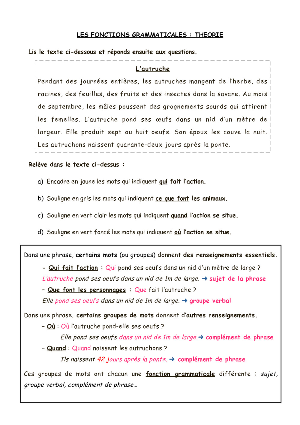 Fiche explicative sur les fonctions grammaticales, pour les 5-6P