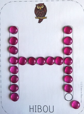 Un atelier pour se familiariser avec la forme des lettres de l’alphabet, apprendre à les reconnaître et exercer sa motricité fine et la coordination oculo-motrice : D’après une idée de La maternelle de Vivi, il s’agit de reproduire les lettres de l’alphabet en perles de verre