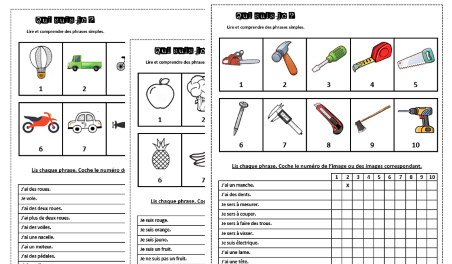 Trois dossiers de 4 pages pour travailler la compréhension écrite. Phrases 1 : compléter la phrase avec le mot juste en observant l'image. Phrases 2 : compléter la phrase avec le mot juste en observant l'image. Phrases 3 : Lire trois phrases et cocher celle qui est en lien avec l'image.