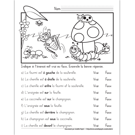 L'élève encercle si l'énoncé est vrai ou faux, 9 énoncés avec les concepts: gauche, droite, entre, devant, derrière, sous et sur. Note de l'équipe BDRP : thème des insectes