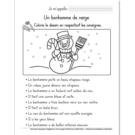 Les élèves colorient le bonhomme de neige en respectant les consignes données.