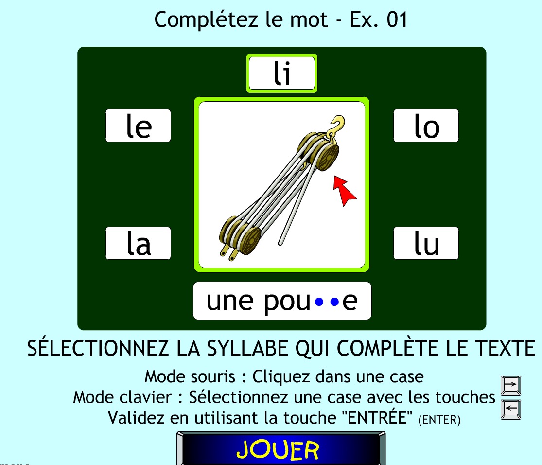 Dans cet exercice, l'élève doit compléter un mot illustré par une image avec les syllabes la,le,li,lo ou lu.