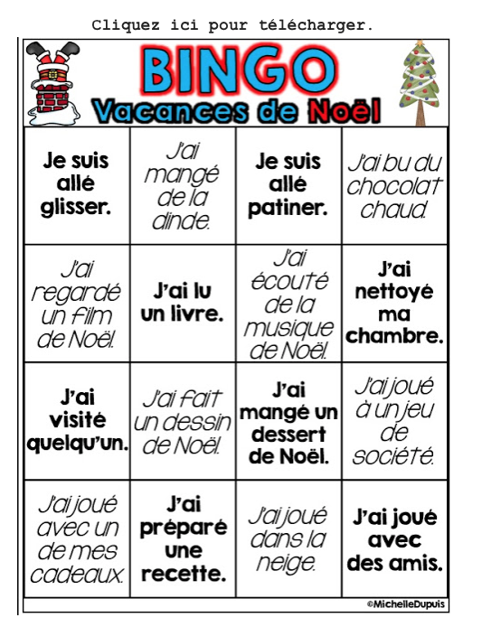 Voici un bingo gratuit sur le thème des vacances de Noël. Ce document permet de discuter avec les enfants des activités effectuées pendant les vacances de Noël.