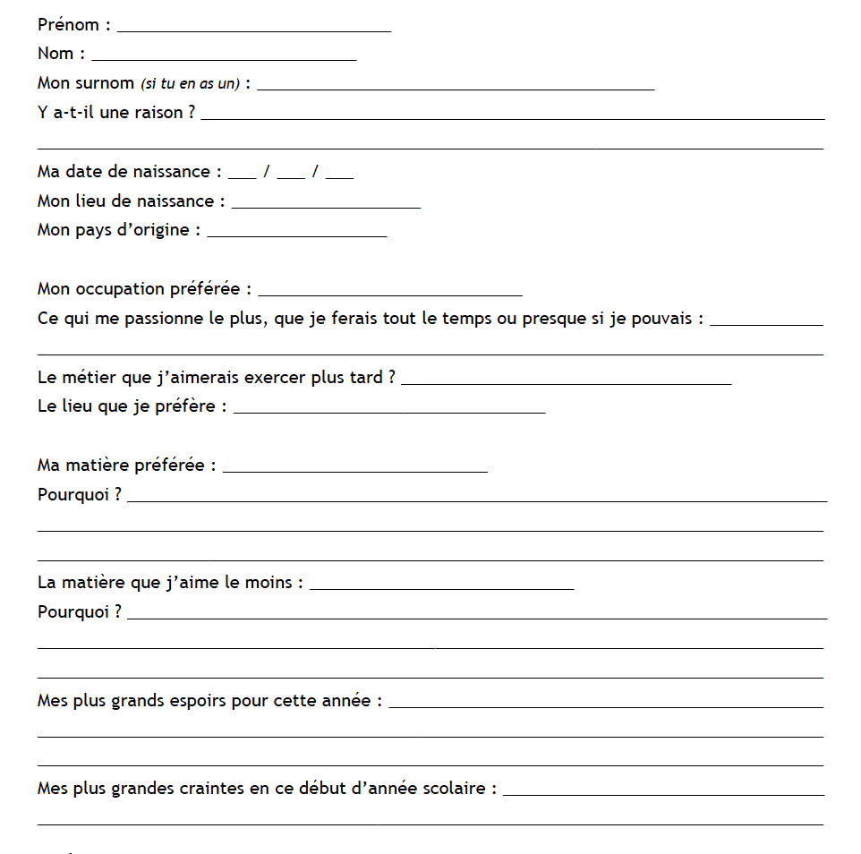 Petit document permettant aux enfants d'écrire quelques données avant de se présenter, en début d'année scolaire par exemple.
