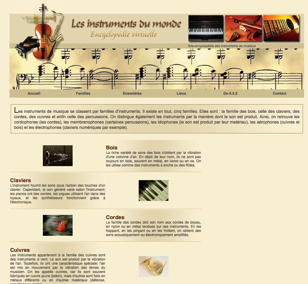 Voilà enfin un site complet qui propose des images, descriptifs et enregistrements audio de beaucoup d'instruments du monde! Les instruments sont classés par famille. Je l'ai personnellement utilisé pour aider des élèves de 6P à s'entraîner à la reconnaissance auditive des instruments. J'ai pu y (...)