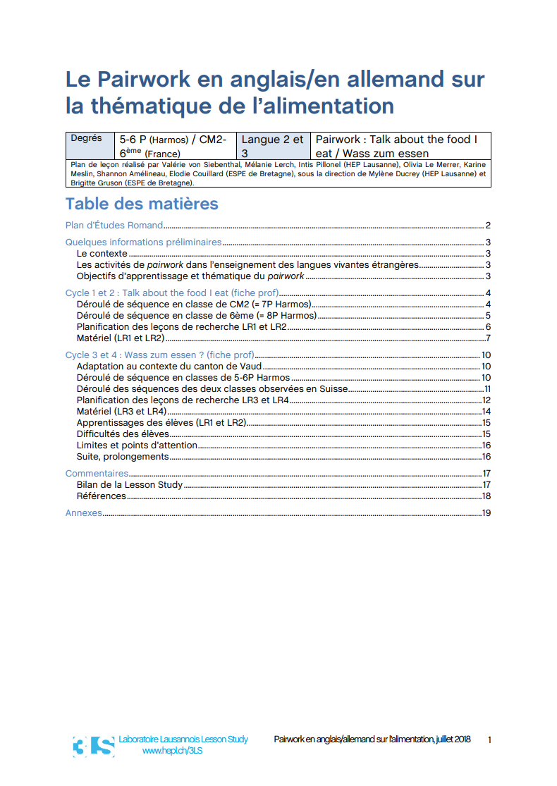 Degré : 5-8H Discipline : Anglais, Allemand Sujet : Production orale en L2 et L3 Mots clés : Pairwork, alimentation Date : Juillet 2018 Vous pouvez retrouver l'ensemble des plans de leçons du Laboratoire Lausannois Lesson Study (3LS) sur le site web suivant: Laboratoire Lausannois Lesson Study (3LS) (...)
