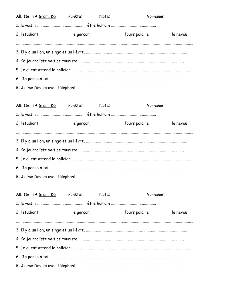 TA = unité 3 (Ich kann sagen, was ich gern mache und was nicht. (Ich spiele gern) TA = unités 4-5 ( affaires d'écoles + couleurs) TA = unité 6 ( Ich kann Personen beschreiben. ) TA unités 8 +9 ( Ich kann den Alltag mit Haustieren beschreiben. + Ich kann verschiedene Tiere benennen. ) + vocabulaire (...)