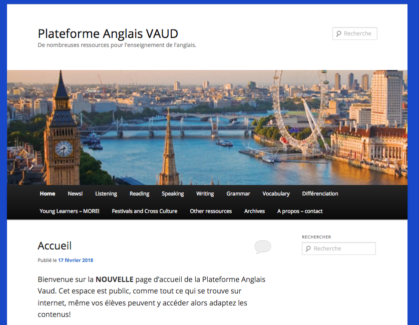 Plateforme de ressources numériques pour les enseignants d'anglais du canton de Vaud. Vous y trouverez des ressources (sites internet, documents) pour les 4 compétences ainsi que pour travailler les outils (voc, grammaire, prononciation). Il y a également quelques exemples d'exercices ou d (...)