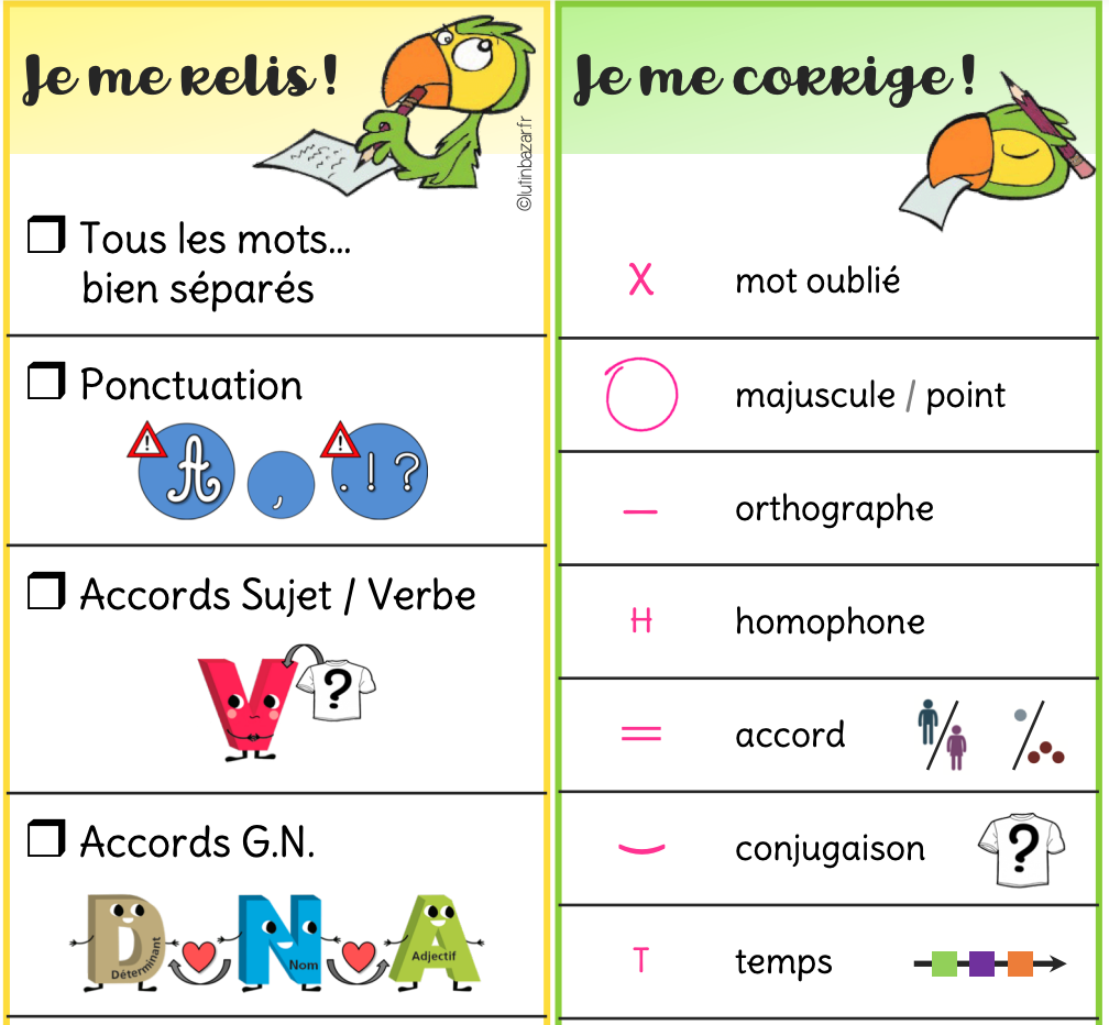 Trouvé chez lutin bazar, un marque-page recto verso pour: 1) se relire après une production d'écrit 2) se corriger après la relecture de l'enseignant. Le tout dans un format pratique à glisser dans le cahier dédié.