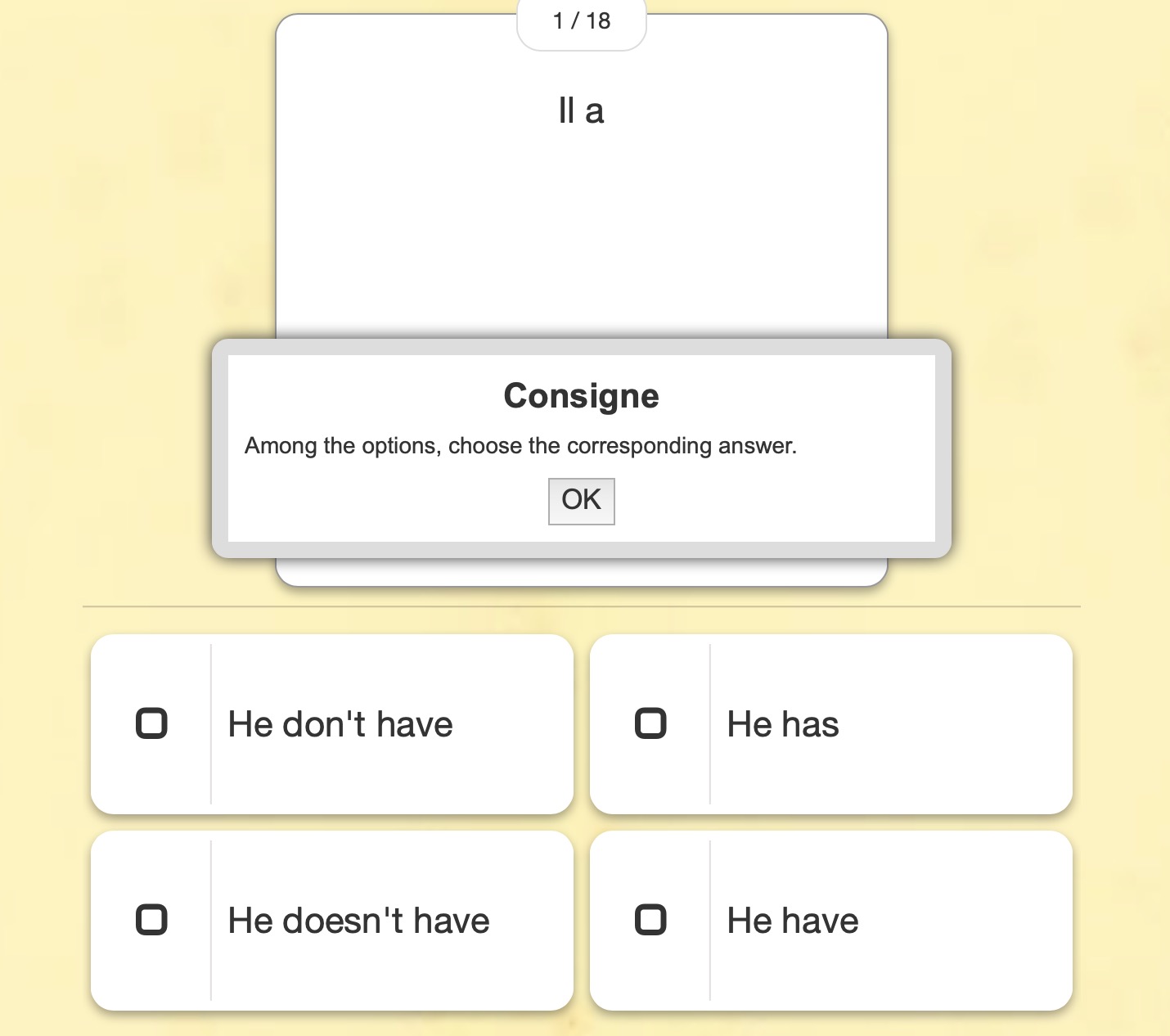 Il s'agit d'un petit quizz pour réviser les formes verbales positives, négatives et interrogatives du verbe 'avoir' en anglais. Les élèves doivent choisir pour chaque forme demandée, l'option qui correspond parmi celles proposées.