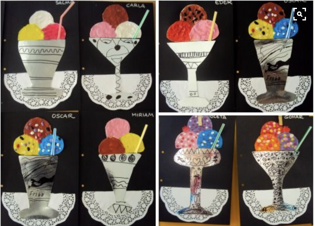 Vive l'été.... Hummmm un bon dessert ! Imagine TA coupe glacée. La coupe, exercice de décoration...écriture.... Les boules : couleurs, découpage. NB : avant ou après cet exercice, pensez à faire une dégustation de glaces avec les enfants !!!