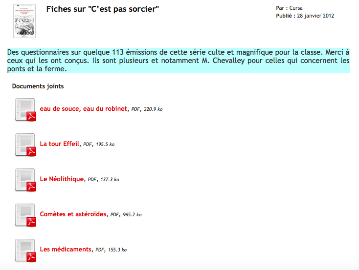 Voici un site qui propose des fiches pour une trentaine d'émissions "C'est pas sorcier". Cycle 2 Note de la BDRP: Maintenant pour plus de 100 émissions