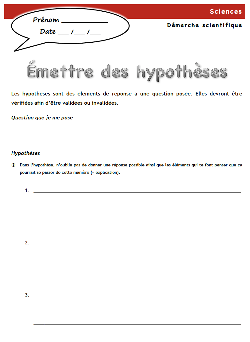 Ce fichier comprend quelques documents à compléter pour aider les élèves à entrer dans la démarche scientifique: émettre des hypothèses établir un protocole d'expérimentation rédiger un rapport d'expérimentation MEMO : Pour expérimenter
