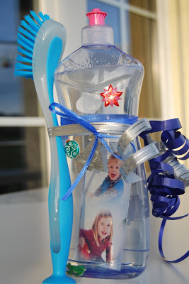 Fête des Mères : Plastifier la photo, la glisser dans le flacon , introduire le savon liquide......