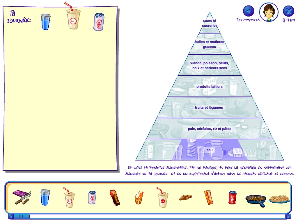 Le site erasme.org [1] propose quatre animations sur le thème de l’éducation à la santé dont un test sur l’équilibre alimentaire Il s’agit d’une animation interactive qui permet de constituer ses repas d’une journée, à différents endroits, pour remplir sa pyramide alimentaire. Sur l’écran de la (...)