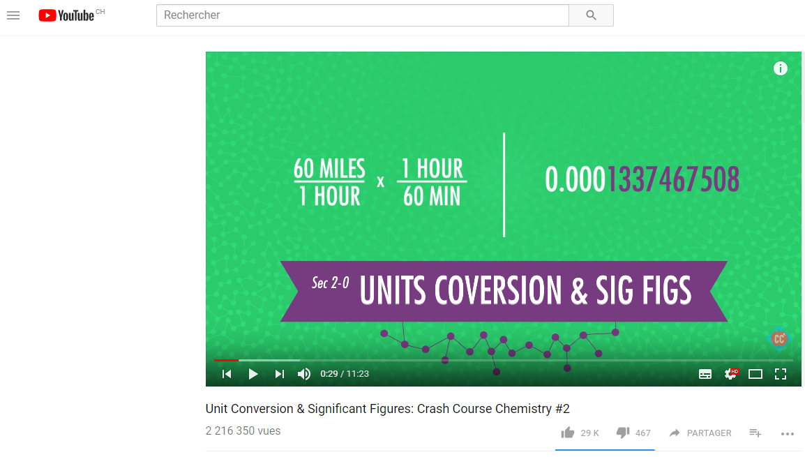 (ENG). Possibilité d'activer les sous-titres en français (et d'autres langues). Explication de ce que sont les unités, leur importance en science (pas seulement en chimie), comment les convertir, le système international d'unités et les chiffres significatifs.