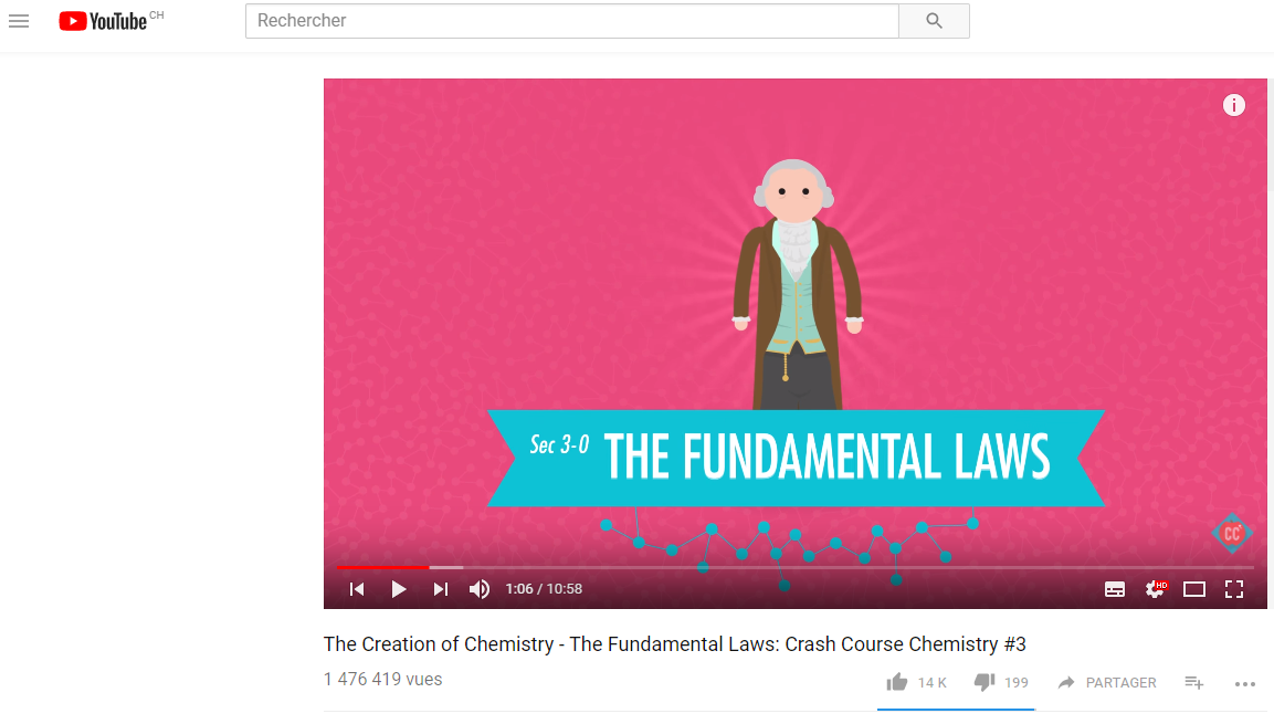 (ENG). Possibilité d'activer les sous-titres en français (et d'autres langues). La vidéo détaille les débuts de la chimie en tant que science (i.e. de l'alchimie à la chimie) avec l'établissement des lois fondamentales: le principe de Lavoisier (conservation de masse), la loi des proportions (...)