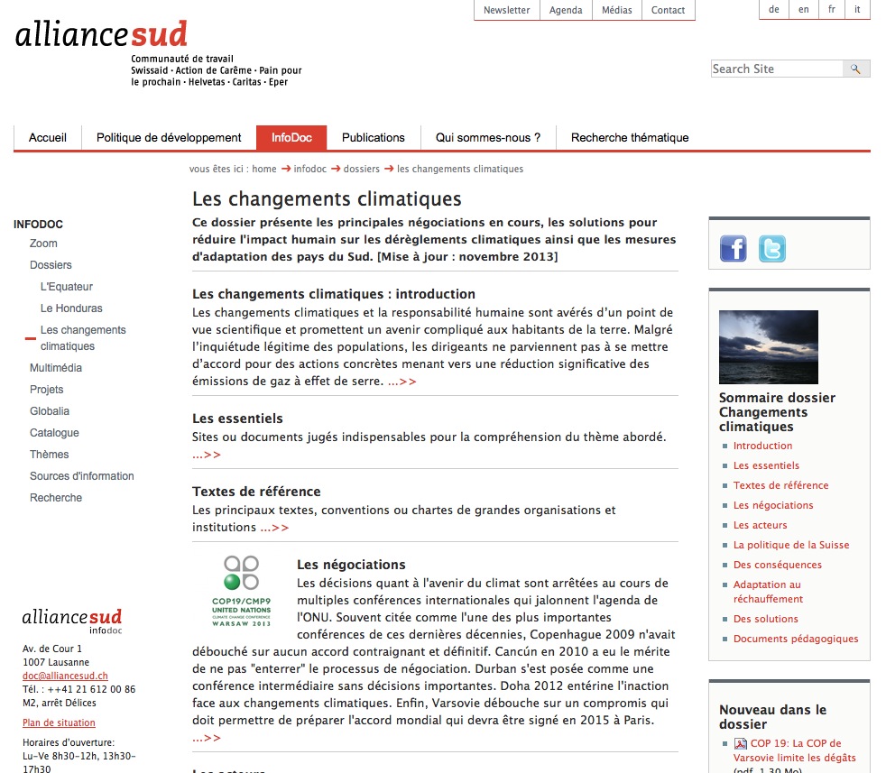 Dossier en ligne proposé par le centre de documentation d’Alliancesud qui présente les principales négociations en cours, les solutions pour réduire l’impact humain sur les dérèglements climatiques, ainsi que les mesures adoptées par les pays du Sud. Ressource repérée sur education 21