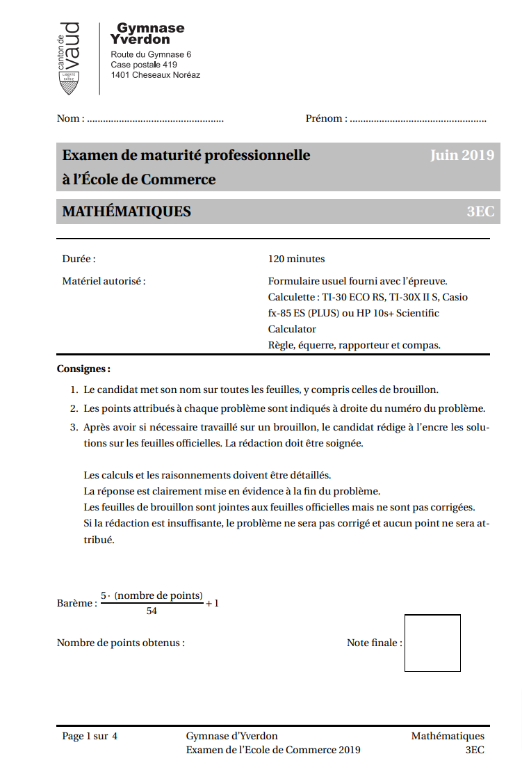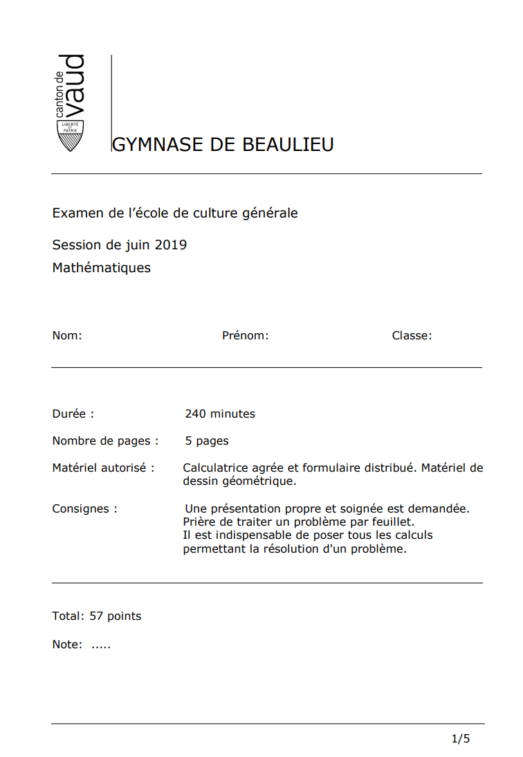 Recueil d'examens en mathématiques niveau renforcé : Gymnase d'Yverdon, Beaulieu, Bugnon, Nyon et Morges.