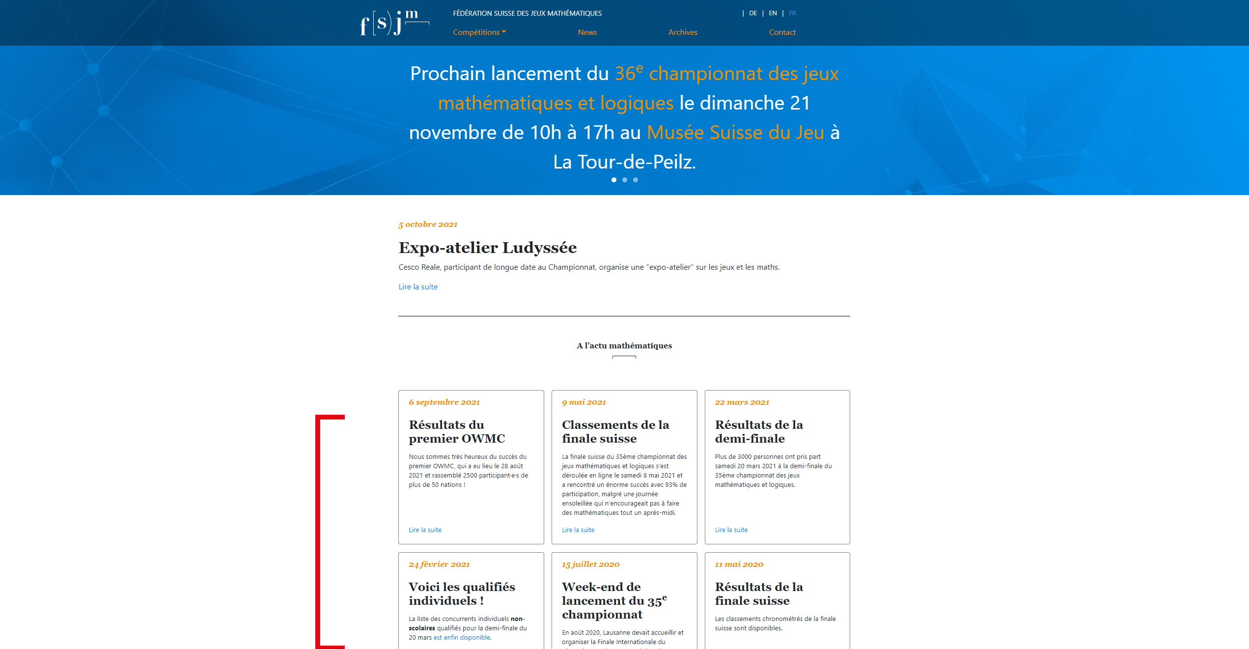 La Fédération Suisse des Jeux Mathématiques est une association sans but lucratif qui regroupe des passionnés de mathématiques. Ensemble, ils explorent leur passion pour les chiffres et organisent chaque année, pour les candidates et les candidats suisses, les épreuves de qualification du (...)