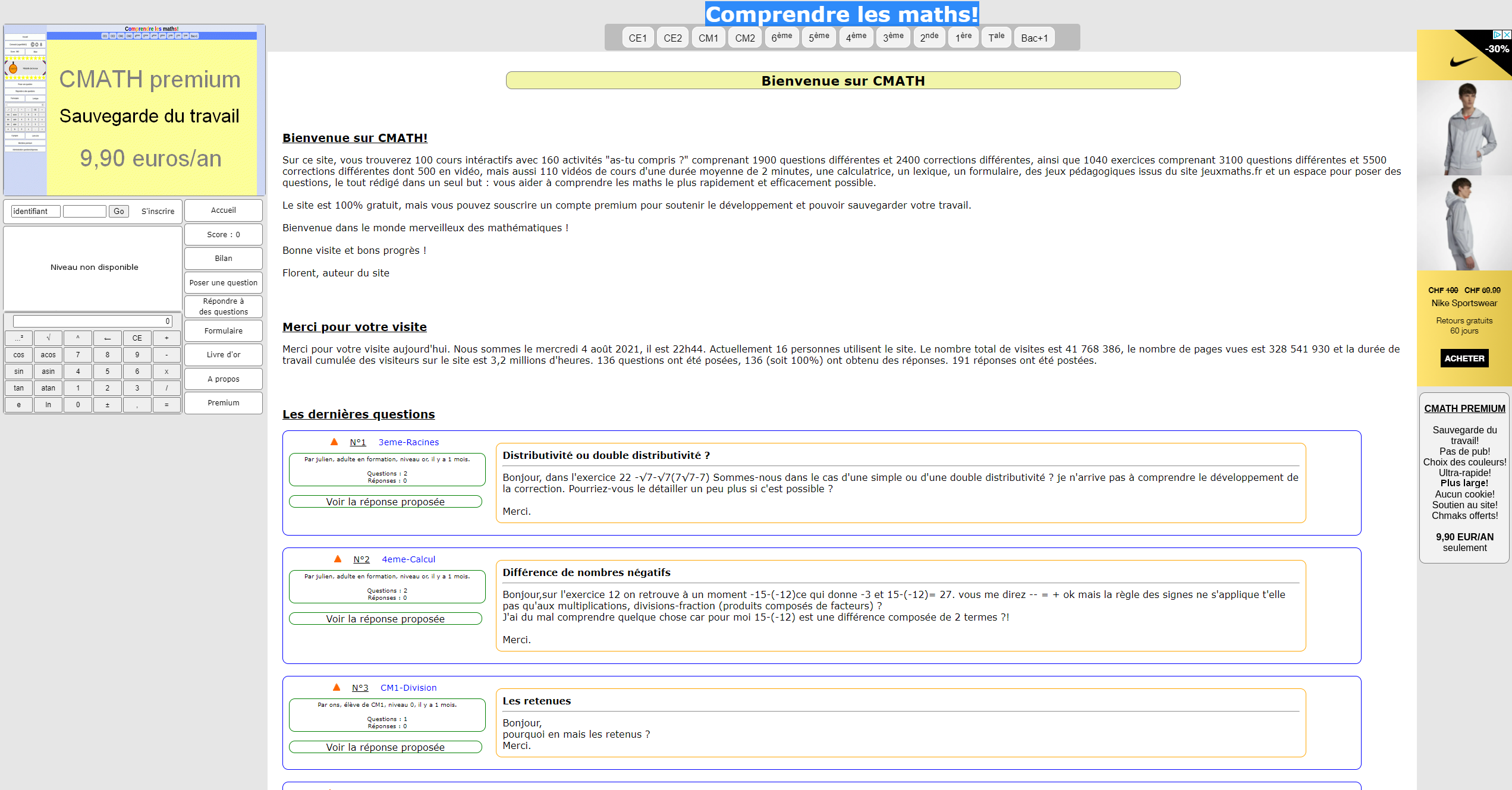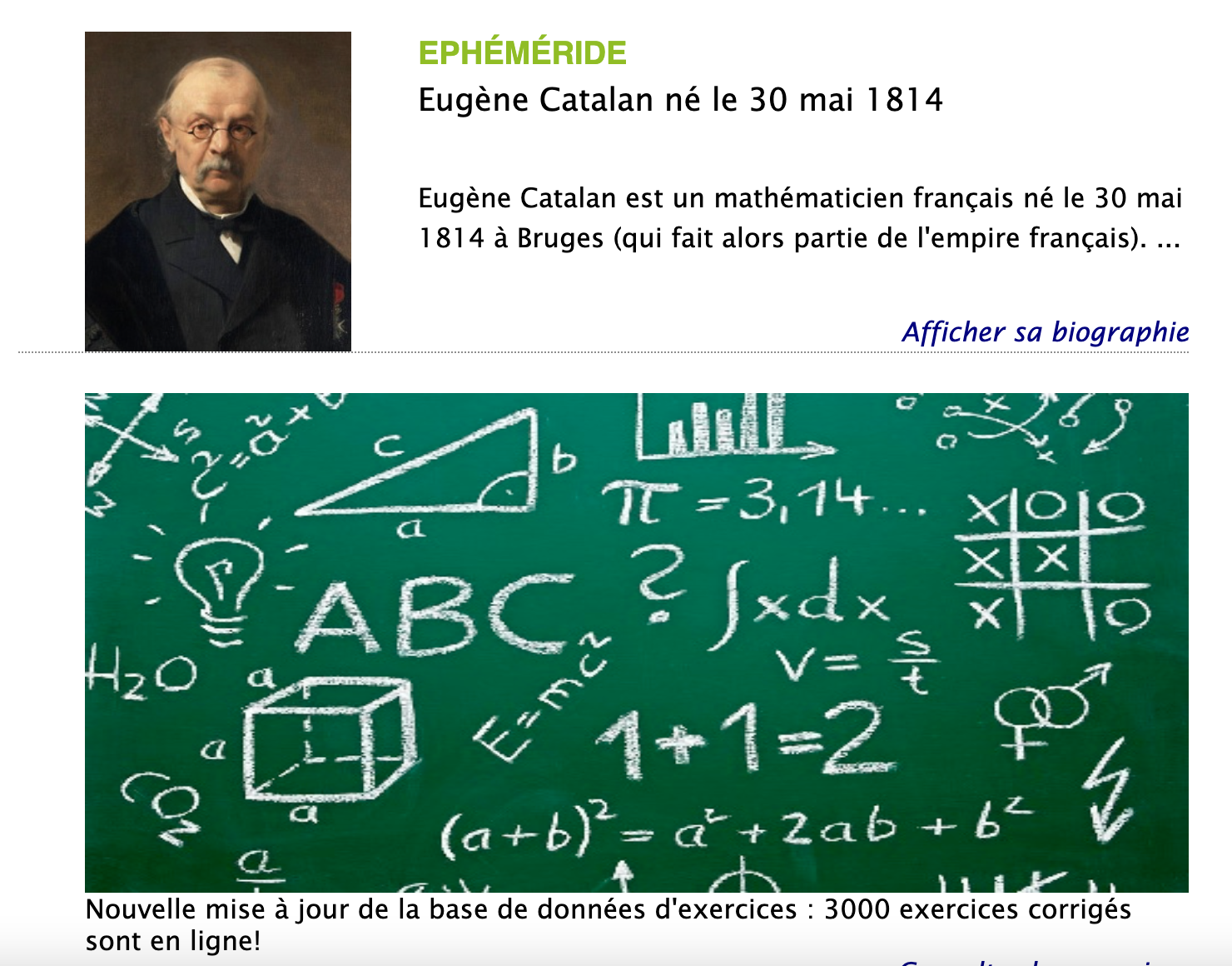 Sur ce site, vous trouverez 100 cours intéractifs avec 160 activités "as-tu compris ?" comprenant 1900 questions différentes et 2400 corrections différentes, ainsi que 1040 exercices comprenant 3100 questions différentes et 5500 corrections différentes dont 500 en vidéo, mais aussi 110 vidéos de (...)