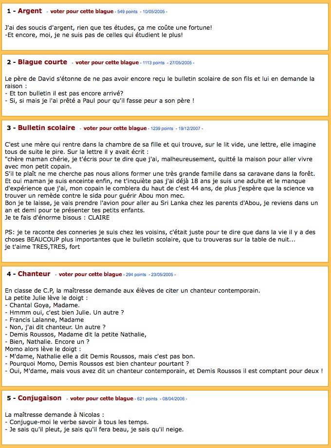 Pierre Puddu, enseignant à la retraite, collecte sur ce site toutes les perles, vidéos qu'il repère sur le Net ainsi que les petites histoires de première main que ses collègues lui envoient. Excellent!