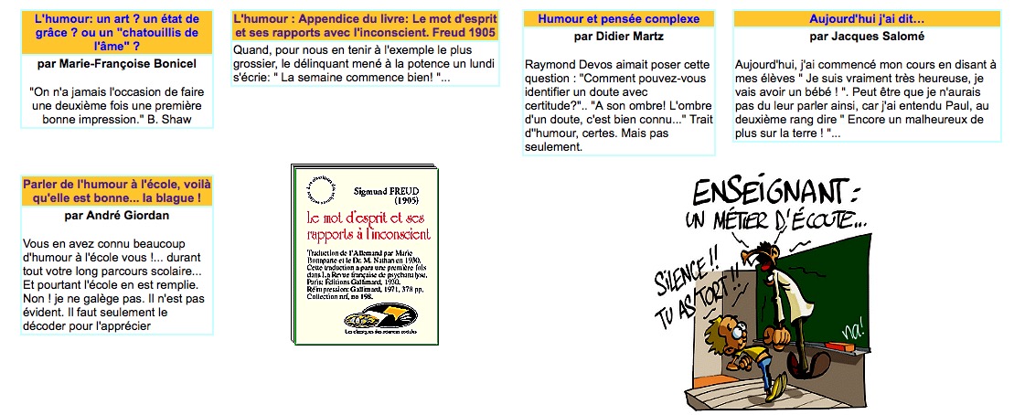 A la recherche d'outils en pédagogie, on pense rarement à l'humour. N'est-ce pas un moyen efficace d'attirer l'attention des élèves quand celle-ci se disperse? Ne peut-on y voir une façon de motiver une classe ? Ou tout cela est-il trop simpliste? Que savons-nous en réalité de l'humour, des (...)