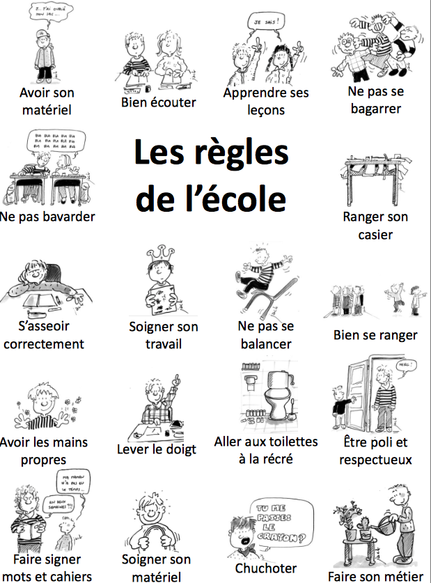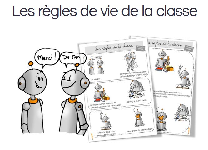 On nous dit : Pour moi, les règles de la classe se doivent d’être claires et concises. Tout rentre dans 3 groupes : le respect des autres , de soi et le respect du matériel . On peut, à partir de ces 3 groupes, y mettre toutes les règles de la classe : .Mon avis : Très jolis dessins, très parlants (...)