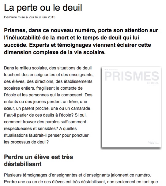 Dans le milieu scolaire, des situations de deuil touchent des enseignantes et des enseignants, des élèves, des directions, des établissements scoaires entiers, fragilisent le contexte de l’école et les personnes qui la composent. Des enfants ou des jeunes perdent un frère, une sœur, un parent proche (...)