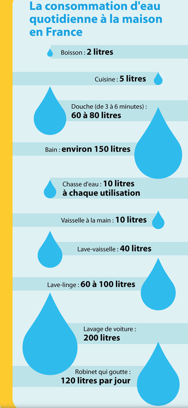 Sur le thème de l'eau: quels usages et quelle consommation moyenne. Les chiffres sont tirés de statistiques en France, mais tout à fait adaptable à la Suisse.