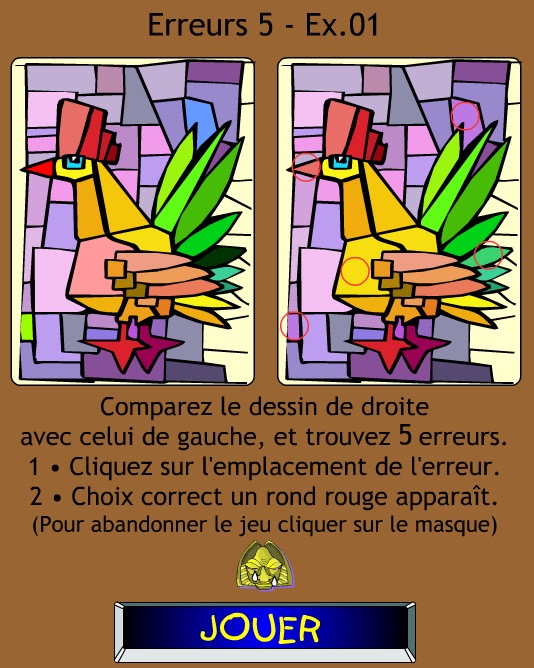 Divers jeux des erreurs niveau maternelle, cinq erreurs par jeu, cliquer dessus pour les marquer. Retour automatique à la liste de jeux des erreurs quand toutes les erreurs ont été identifiées. 9 séries de 5 jeux.