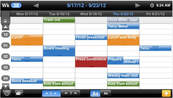 miCal est un calendrier qui a remplacé Calendrier sur mon téléphone. Voici pourquoi : Il a une vue permettant de voir d'un coup d'oeil tous les jours de la semaine (cf. illustration) Un double tap permet de créer directement un évènement Application payante (quelques francs)