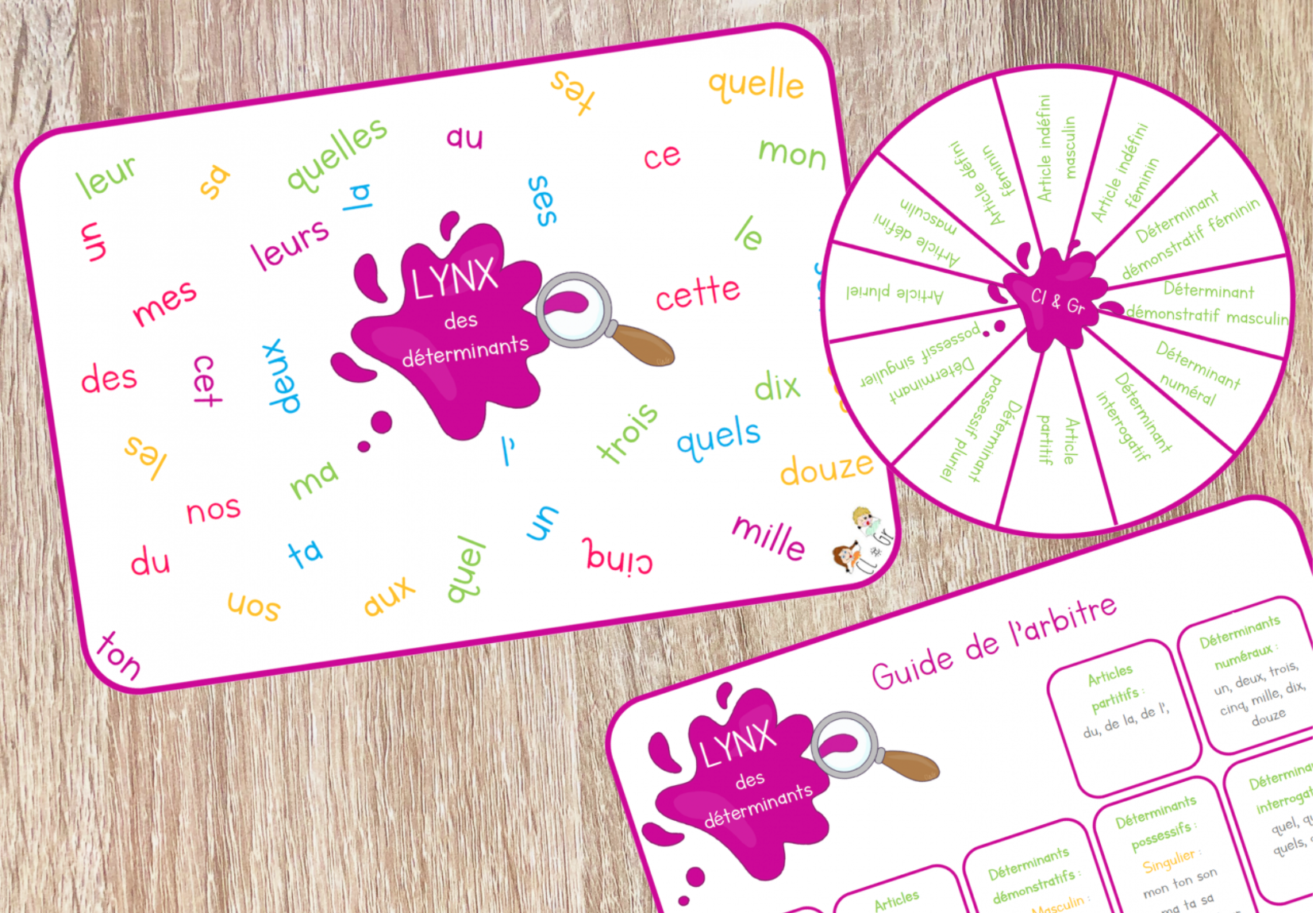 Classe et grimace propose un atelier de grammaire sur les déterminants. Cet atelier s'inspire du jeu "Le Lynx". Le principe ? Faire tourner la roue des déterminants. Être le plus rapide à trouver sur la planche le déterminant demandé.